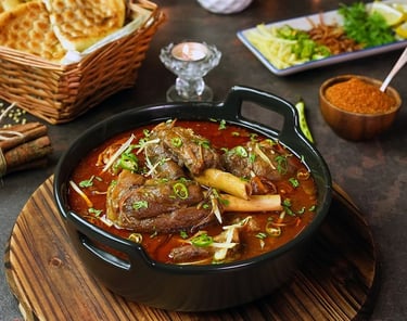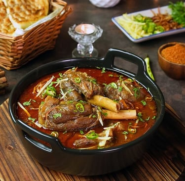 Nihari is a slow-cooked stew that is traditionally enjoyed in the mornings as a hearty breakfast in Old Delhi, but it's perfect at any time of day. Made from mutton or beef, this stew is infused with a variety of aromatic spices, simmered for hours to achieve a rich, flavorful base. The long cooking process ensures that the meat becomes so tender it practically melts in your mouth.